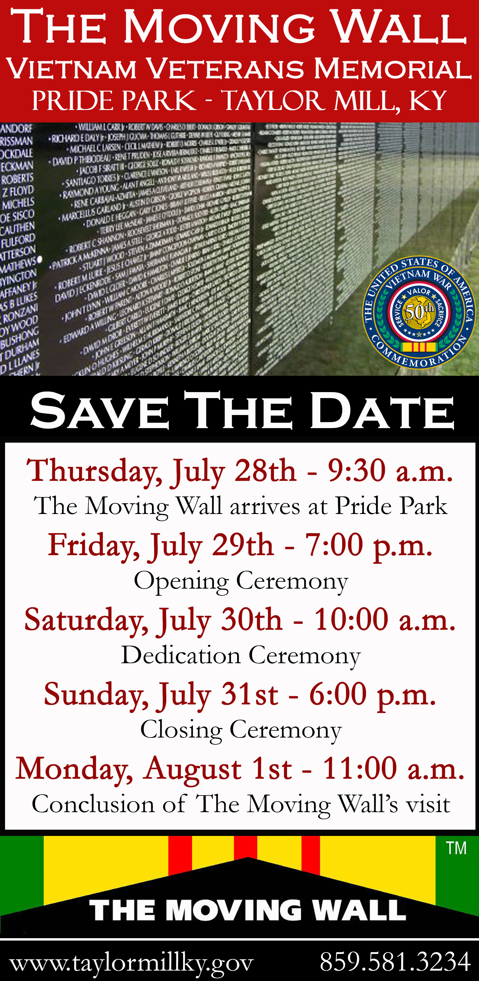 The City of Taylor Mill is proud to announce The Moving Wall, a replica of the Vietnam Veterans Memorial, will be visiting Pride Park in Taylor Mill, KY from Thursday, July 28th, 2016 through Monday, August 1st, 2016.